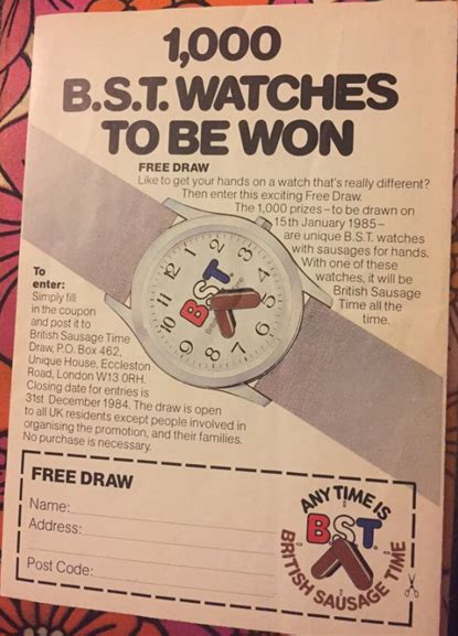 Dial: White with arabic numerals. BST and British Sausage Time printed on the dial