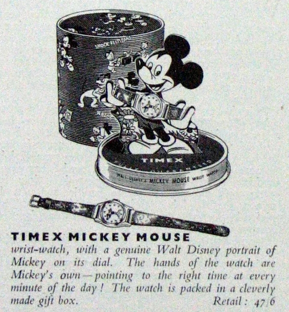 Advert reads: Timex Mickey Mouse wrist-watch, with genuine Walt Disney portrait of Mickey on its dial. The hands of the watch are Mickey’s own – pointing to the right time every minute of the dat! The watch is packed in a cleverly made gift box. Retail 47/6.